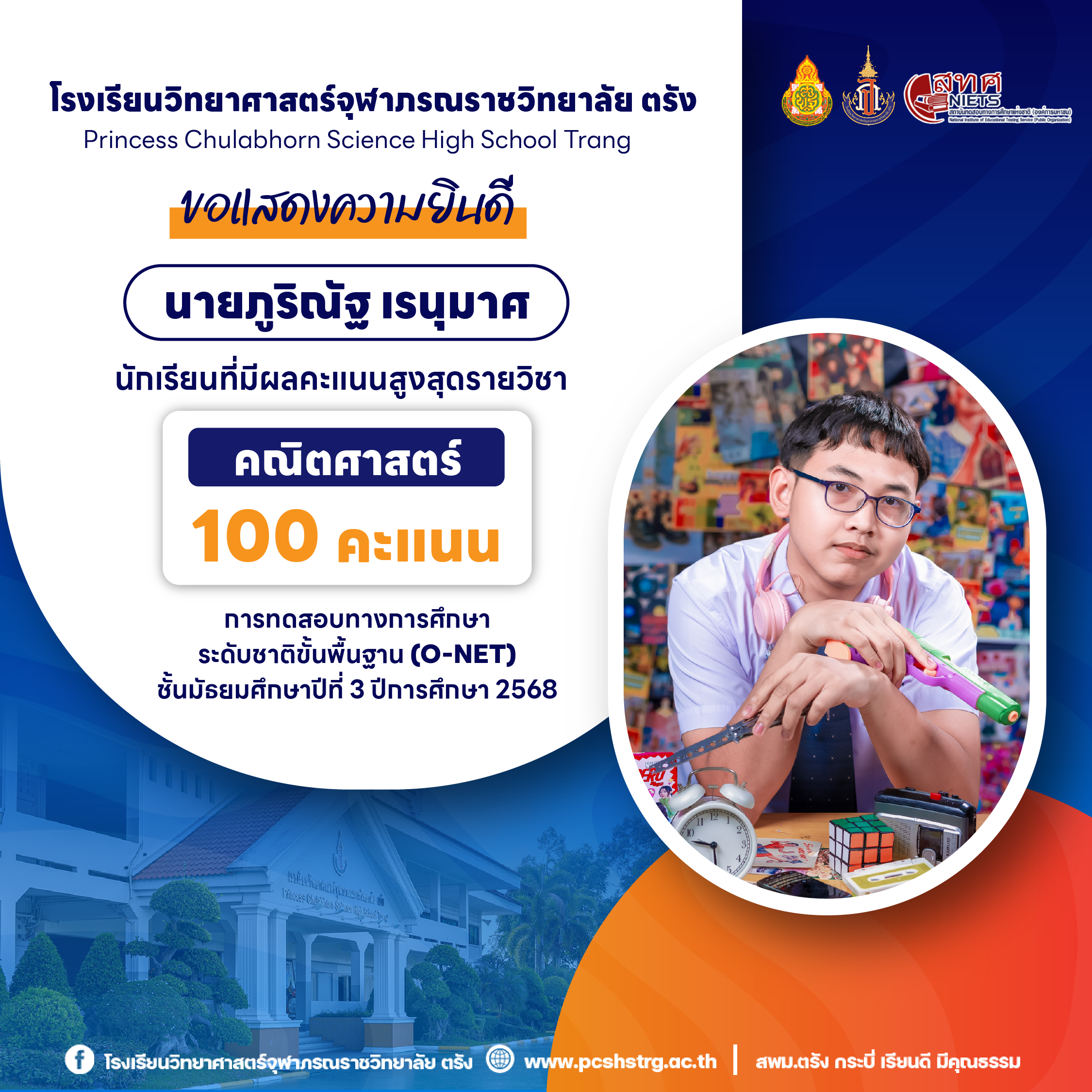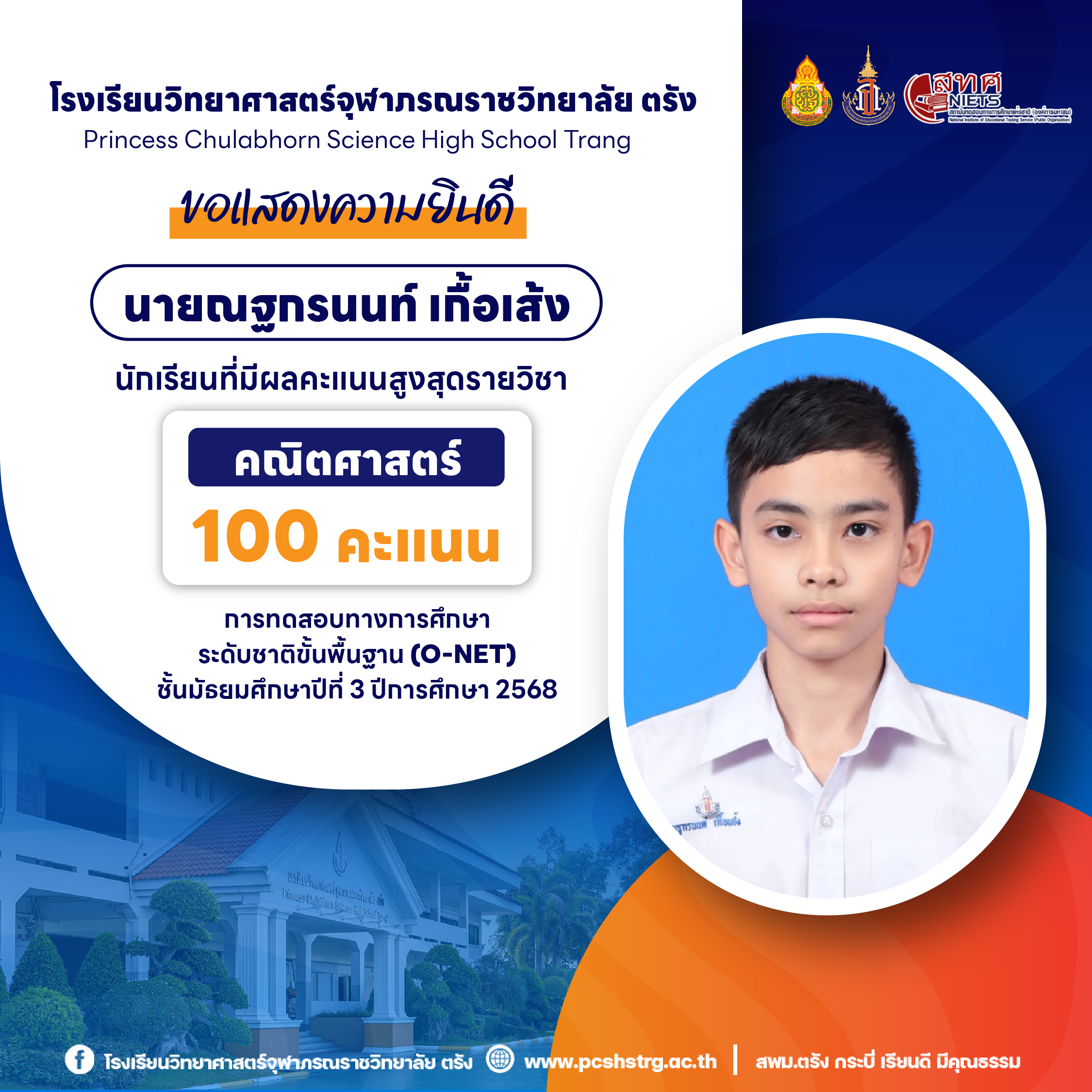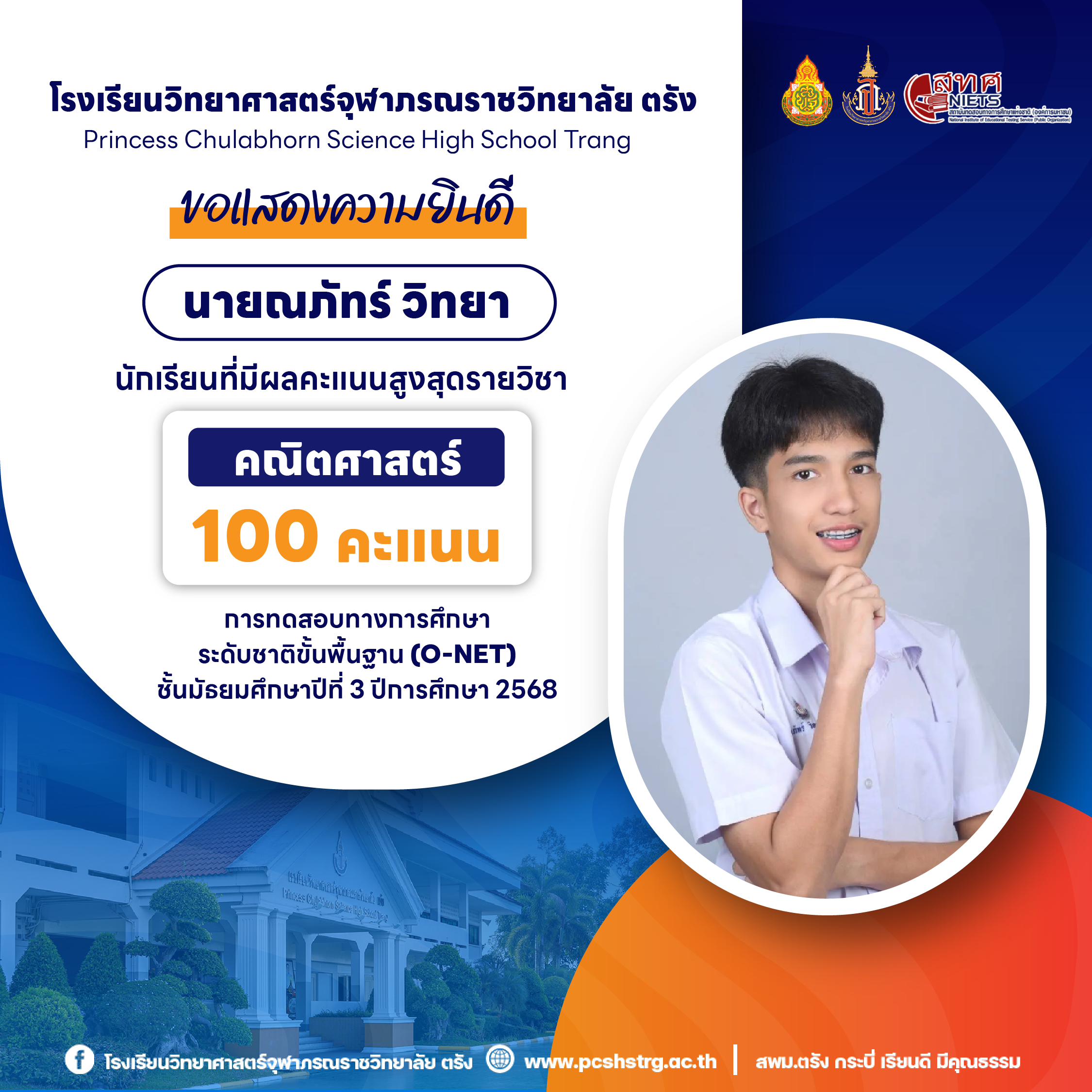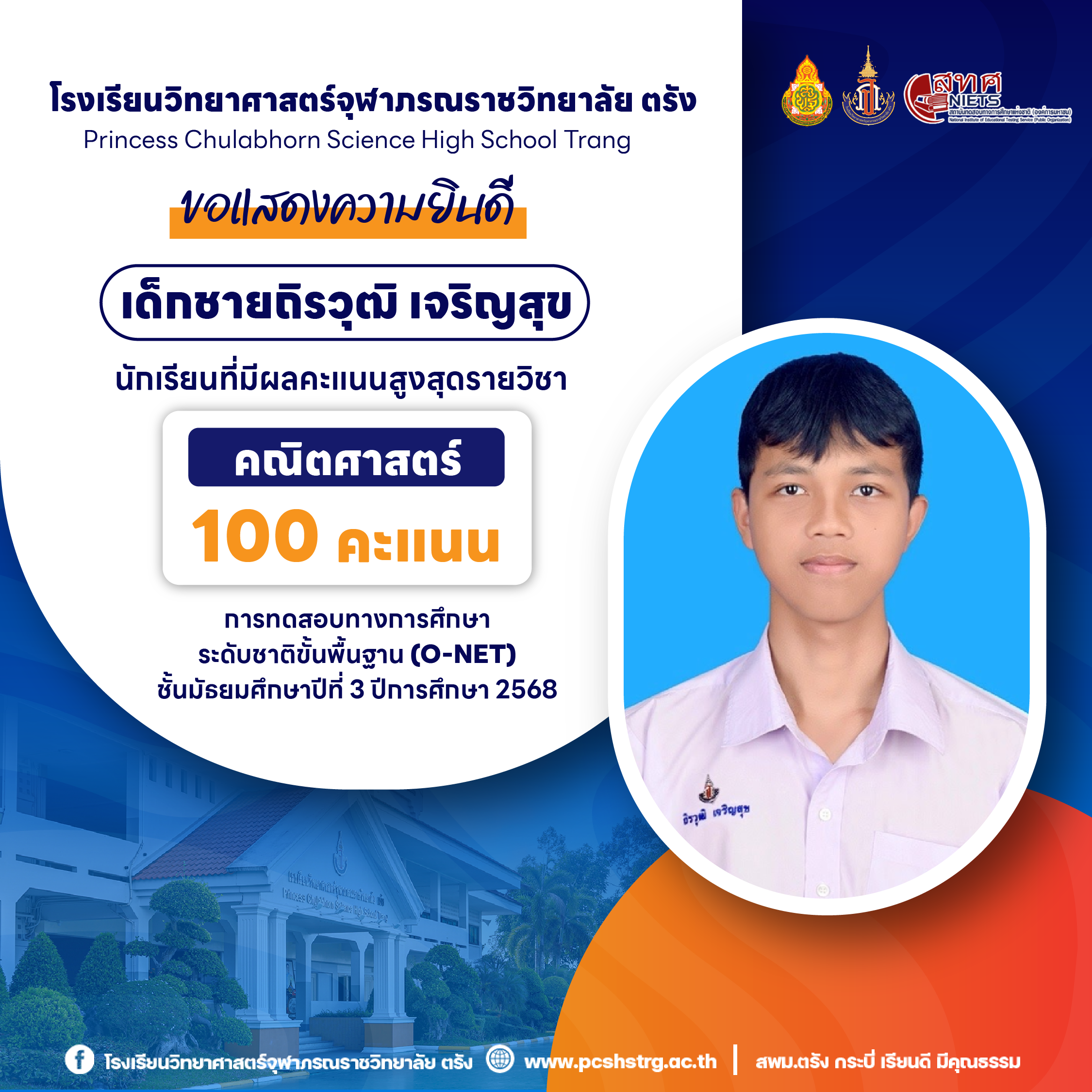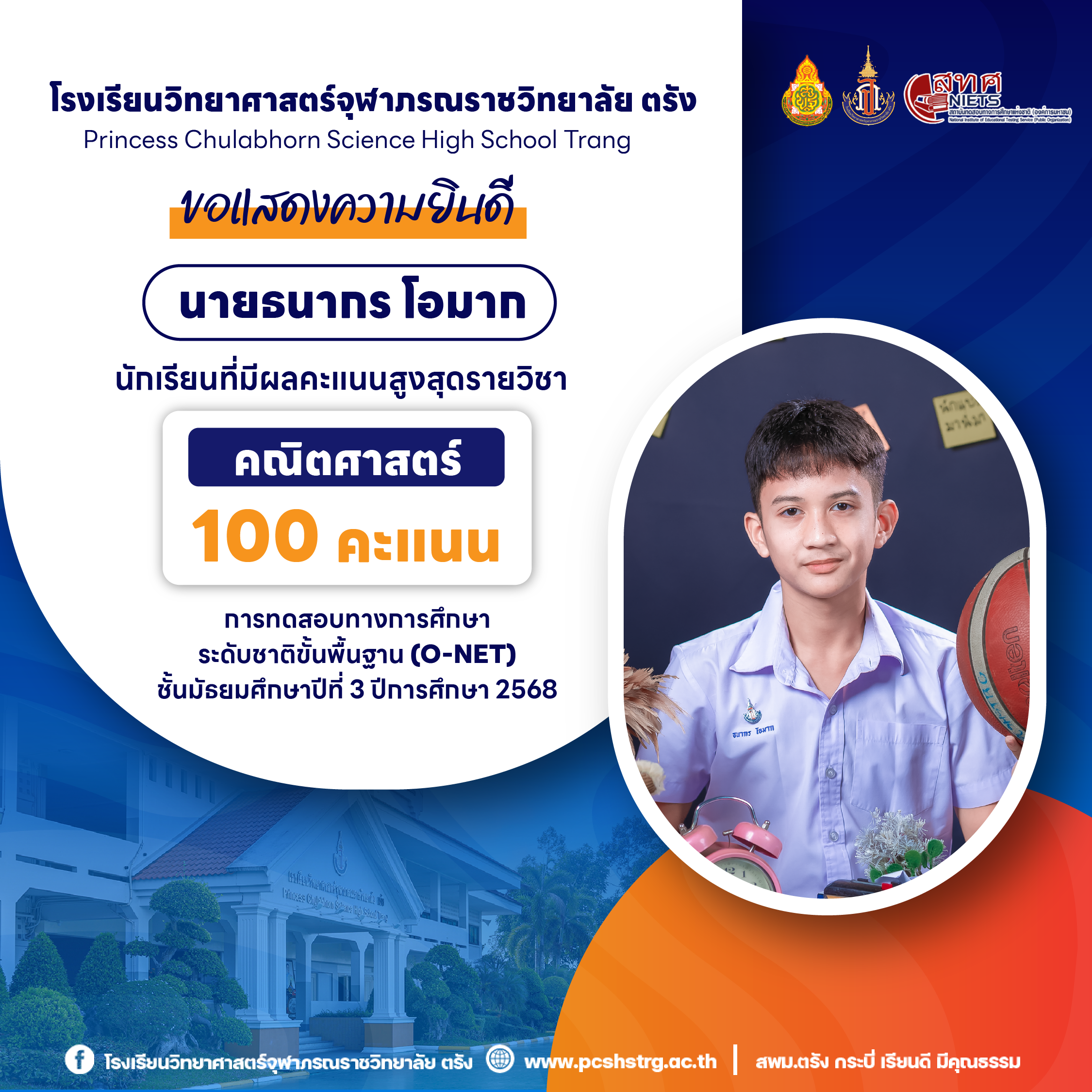 ขอแสดงความยินดีกับนักเรียนที่มีผลการทดสอบทางการศึกษาระดับชาติขั้นพื้นฐาน (O-NET) ชั้นมัธยมศึกษาปีที่ 3 ปีการศึกษา 2568 รายวิชาคณิตศาสตร์ 100 คะแนนเต็ม จำนวน 20 คน และนักเรียนที่มีผลคะแนน วิทยาศาสตร์ อังกฤษ ภาษาไทย สูงสุด