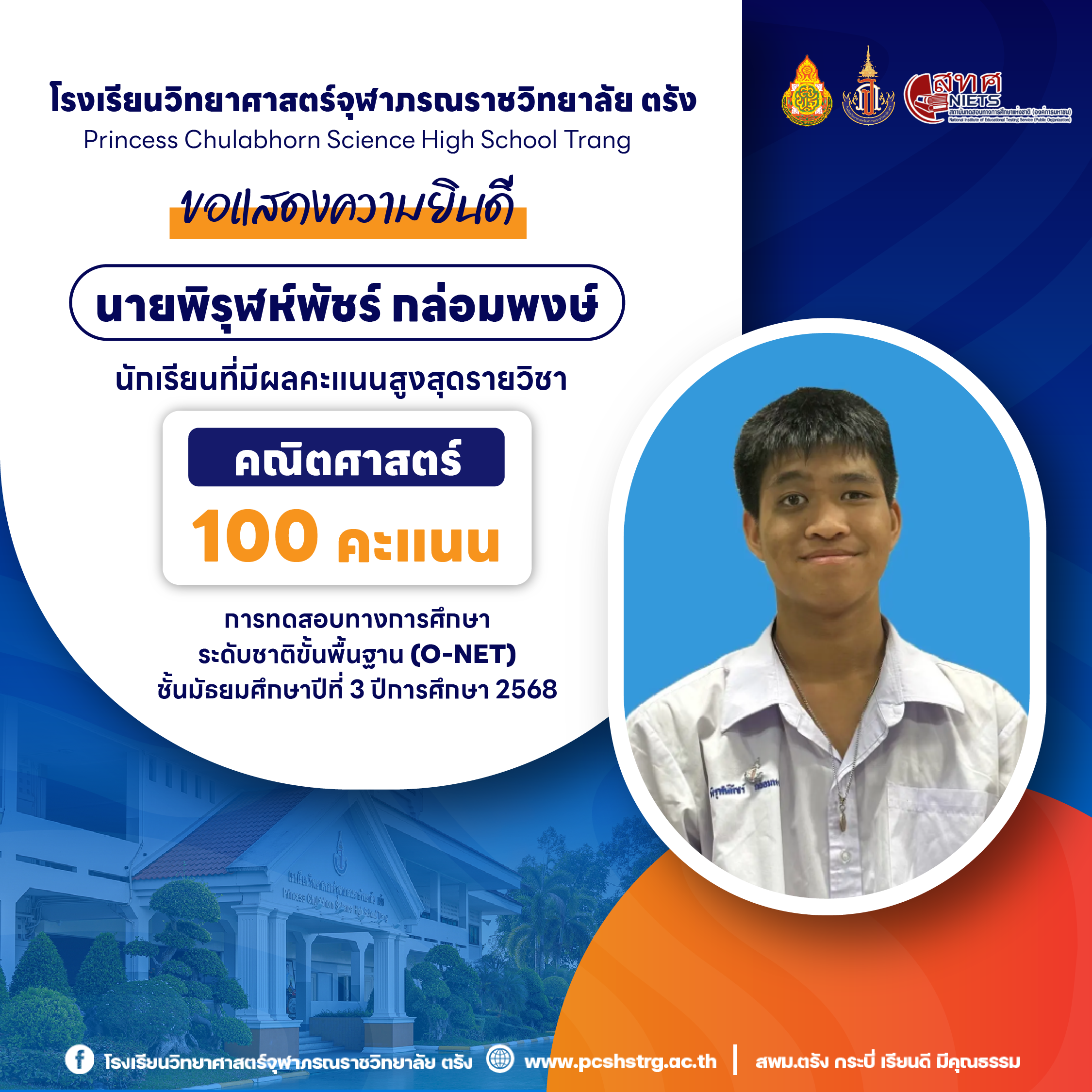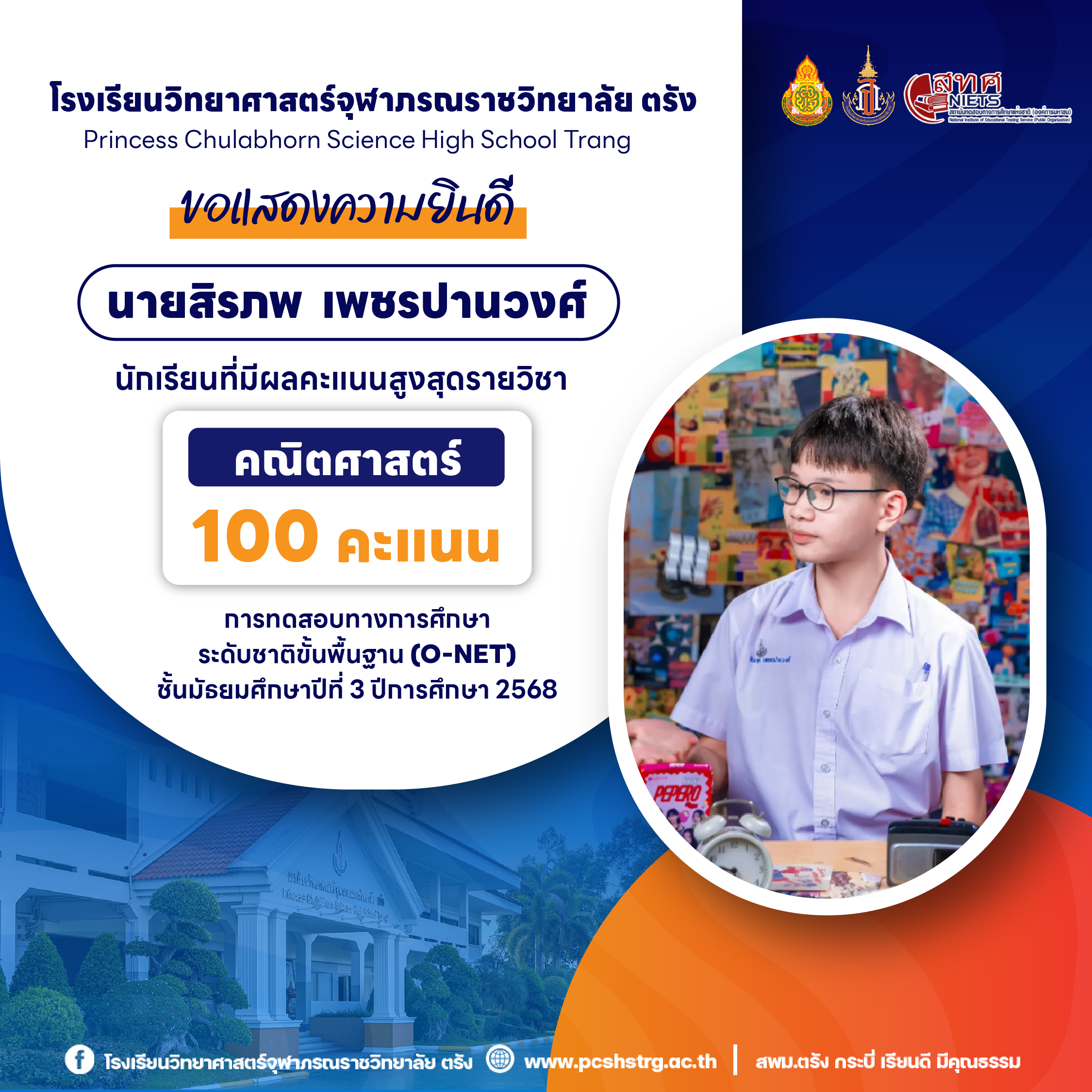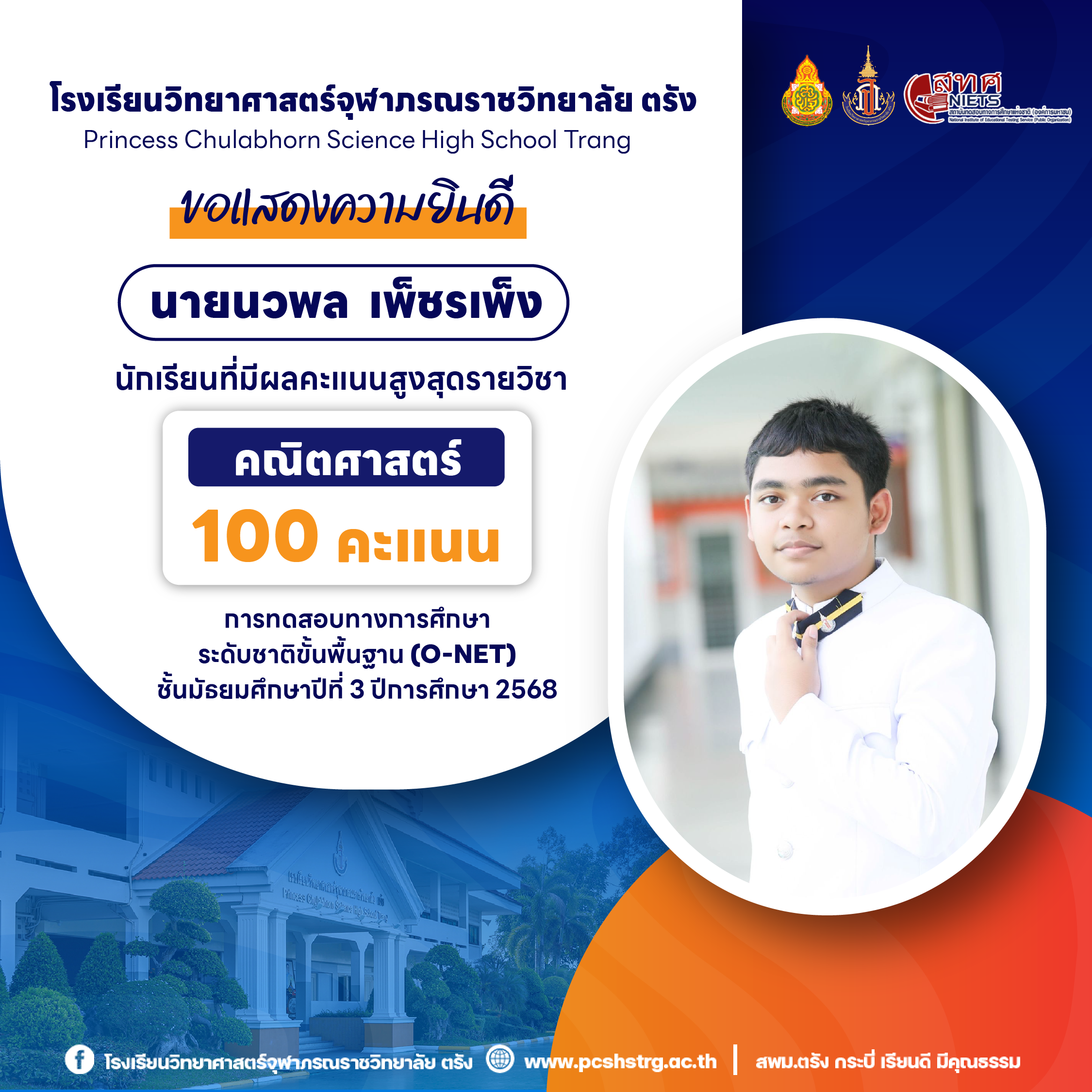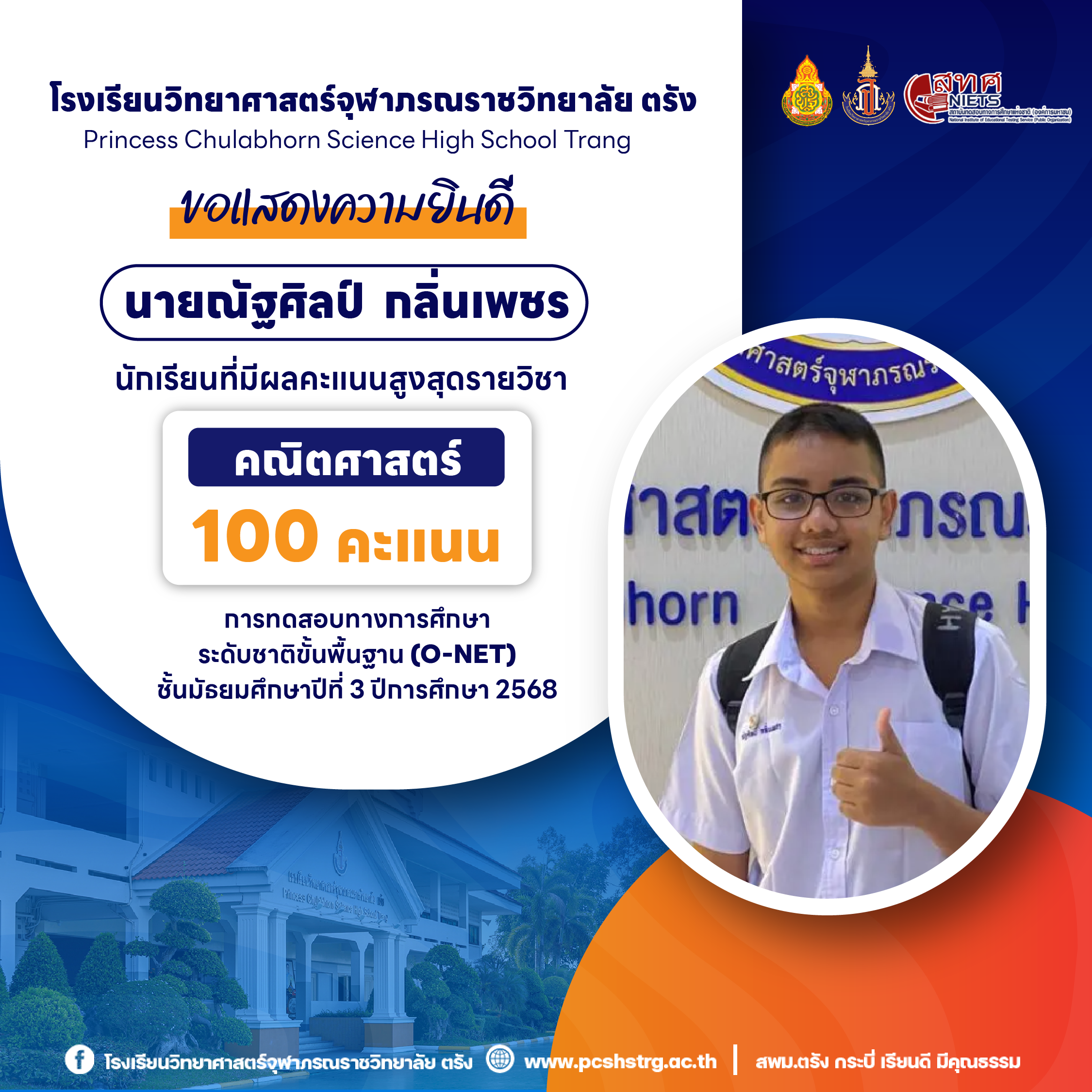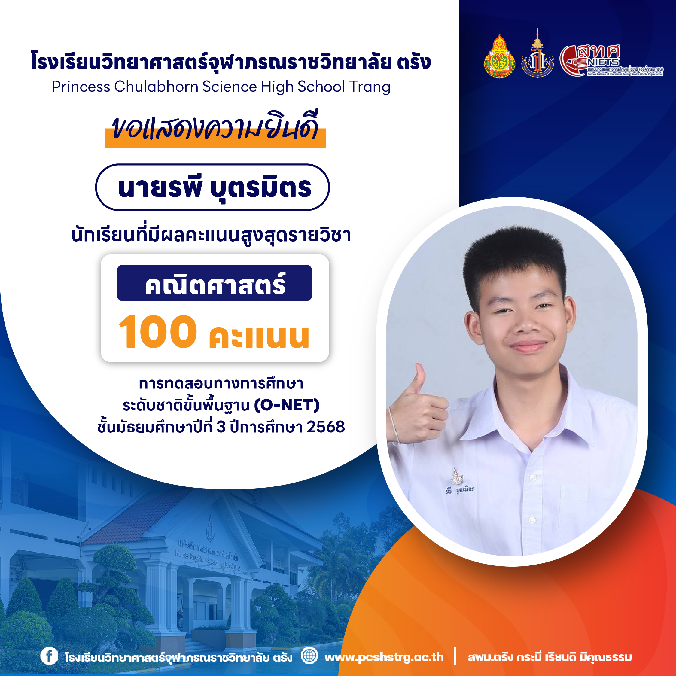 ขอแสดงความยินดีกับนักเรียนที่มีผลการทดสอบทางการศึกษาระดับชาติขั้นพื้นฐาน (O-NET) ชั้นมัธยมศึกษาปีที่ 3 ปีการศึกษา 2568 รายวิชาคณิตศาสตร์ 100 คะแนนเต็ม จำนวน 20 คน และนักเรียนที่มีผลคะแนน วิทยาศาสตร์ อังกฤษ ภาษาไทย สูงสุด