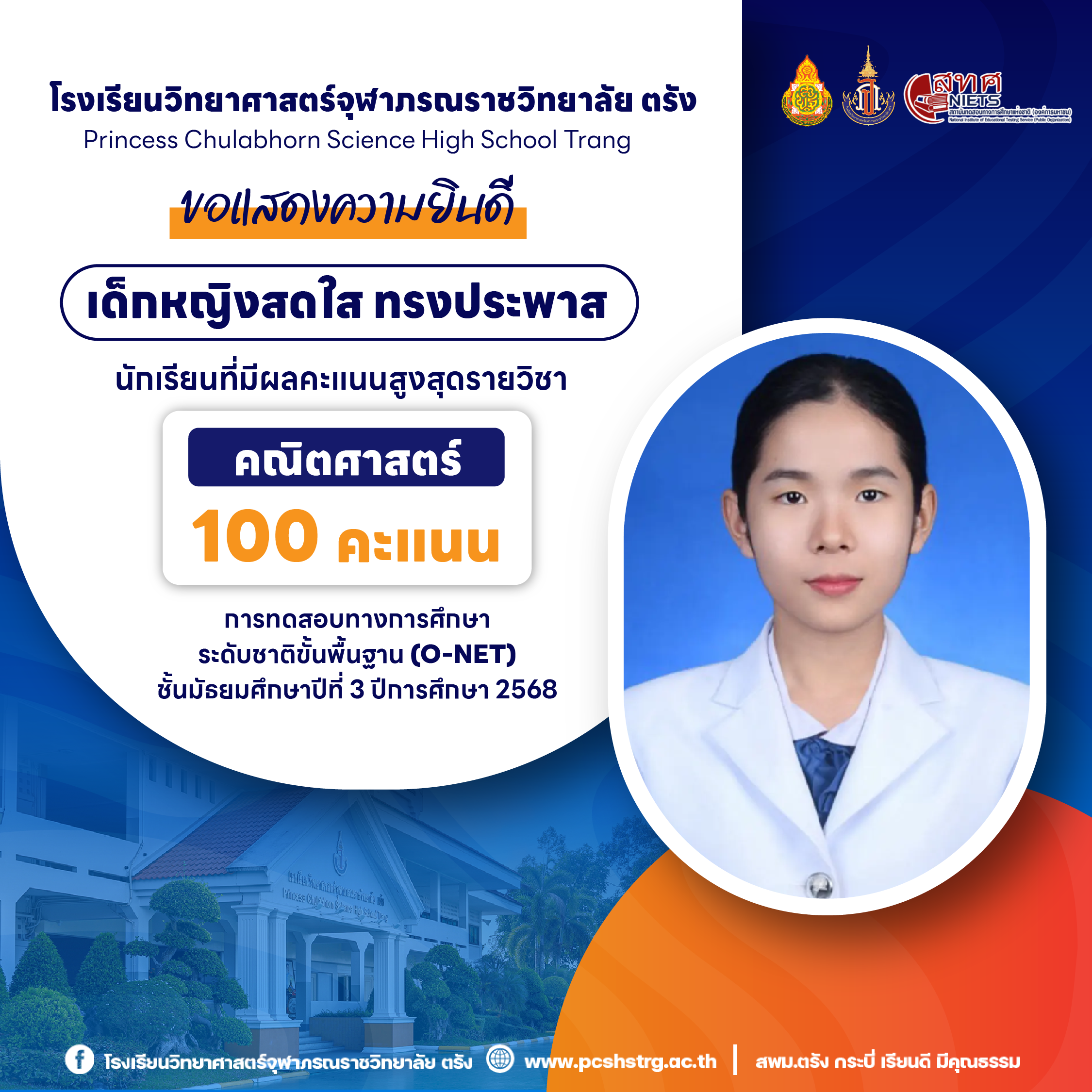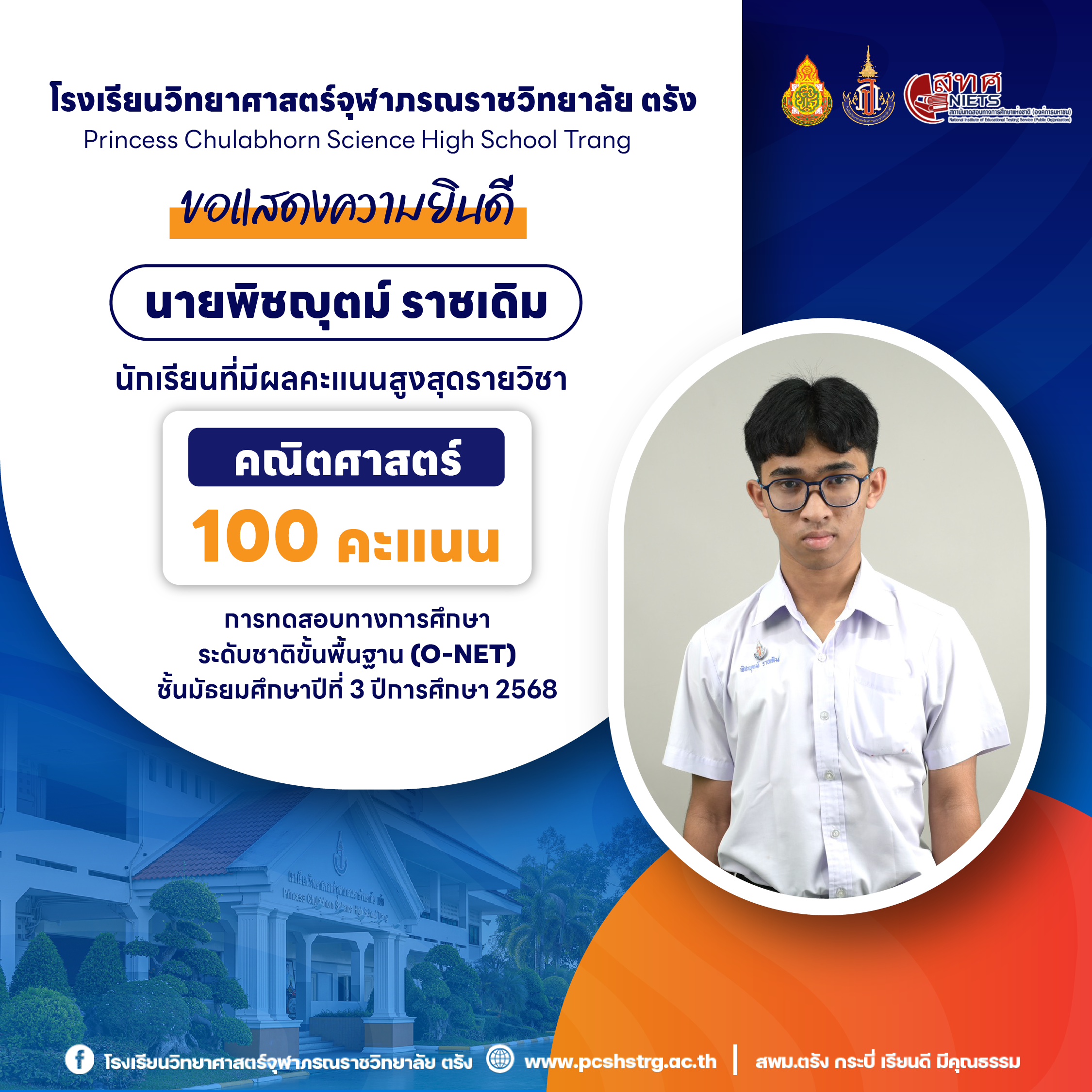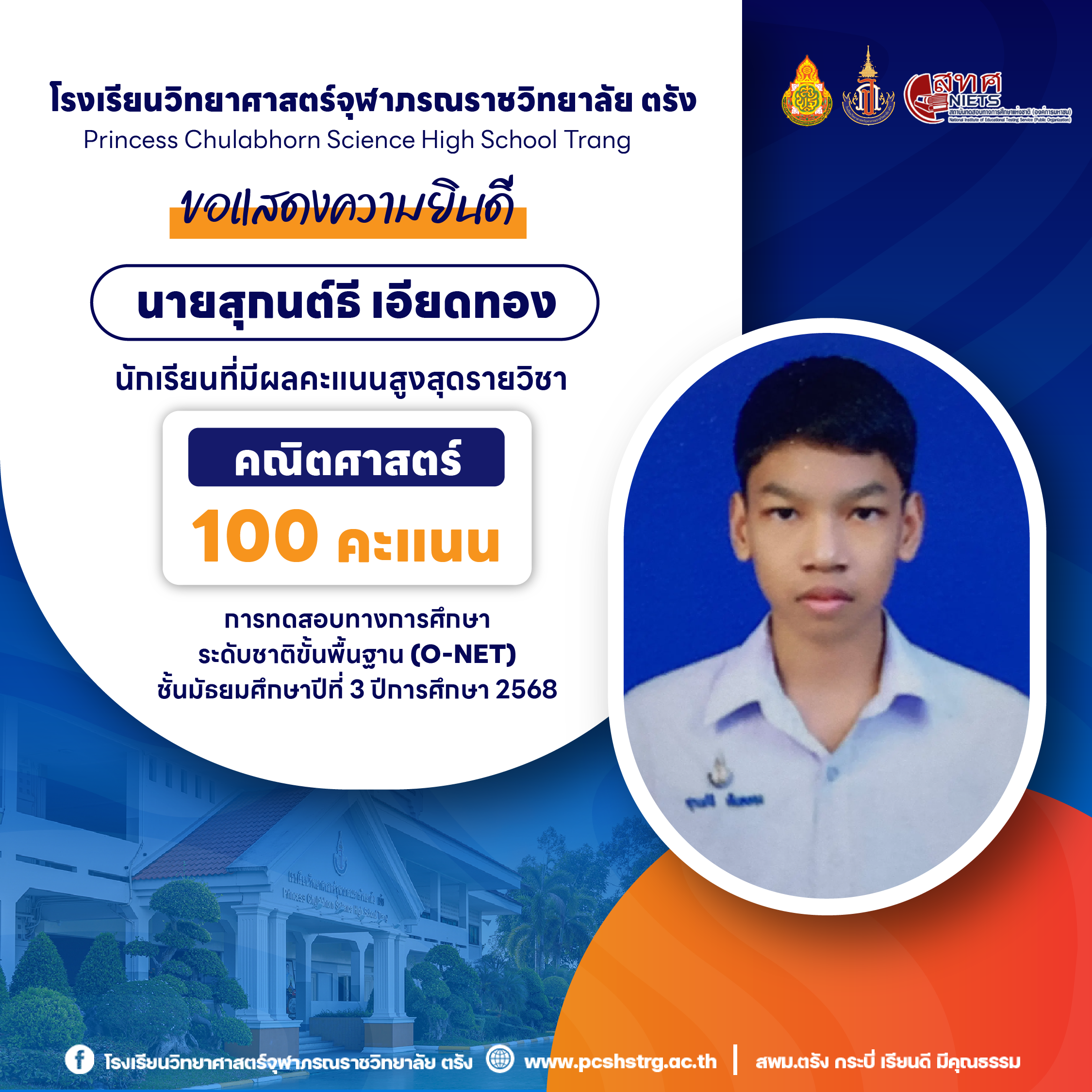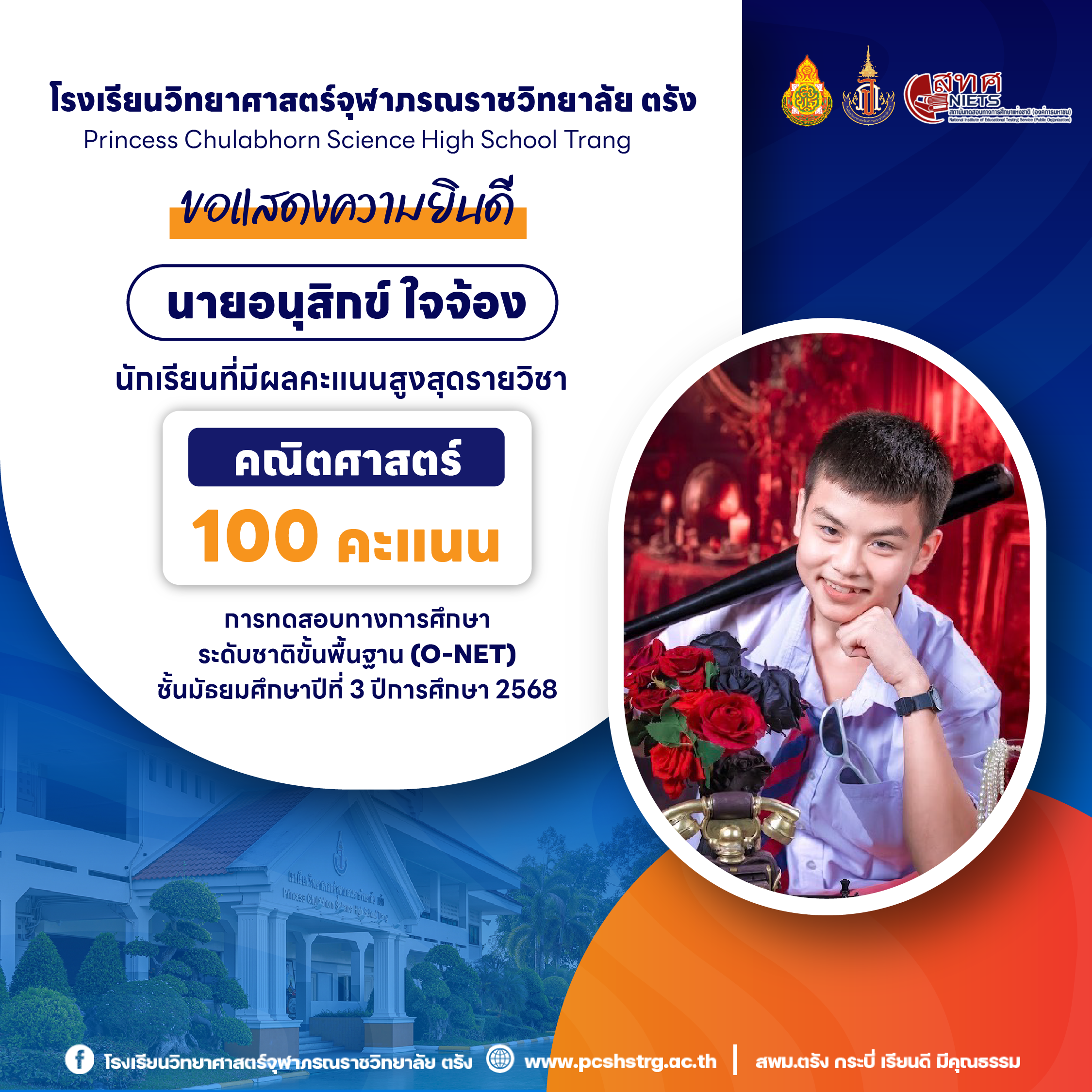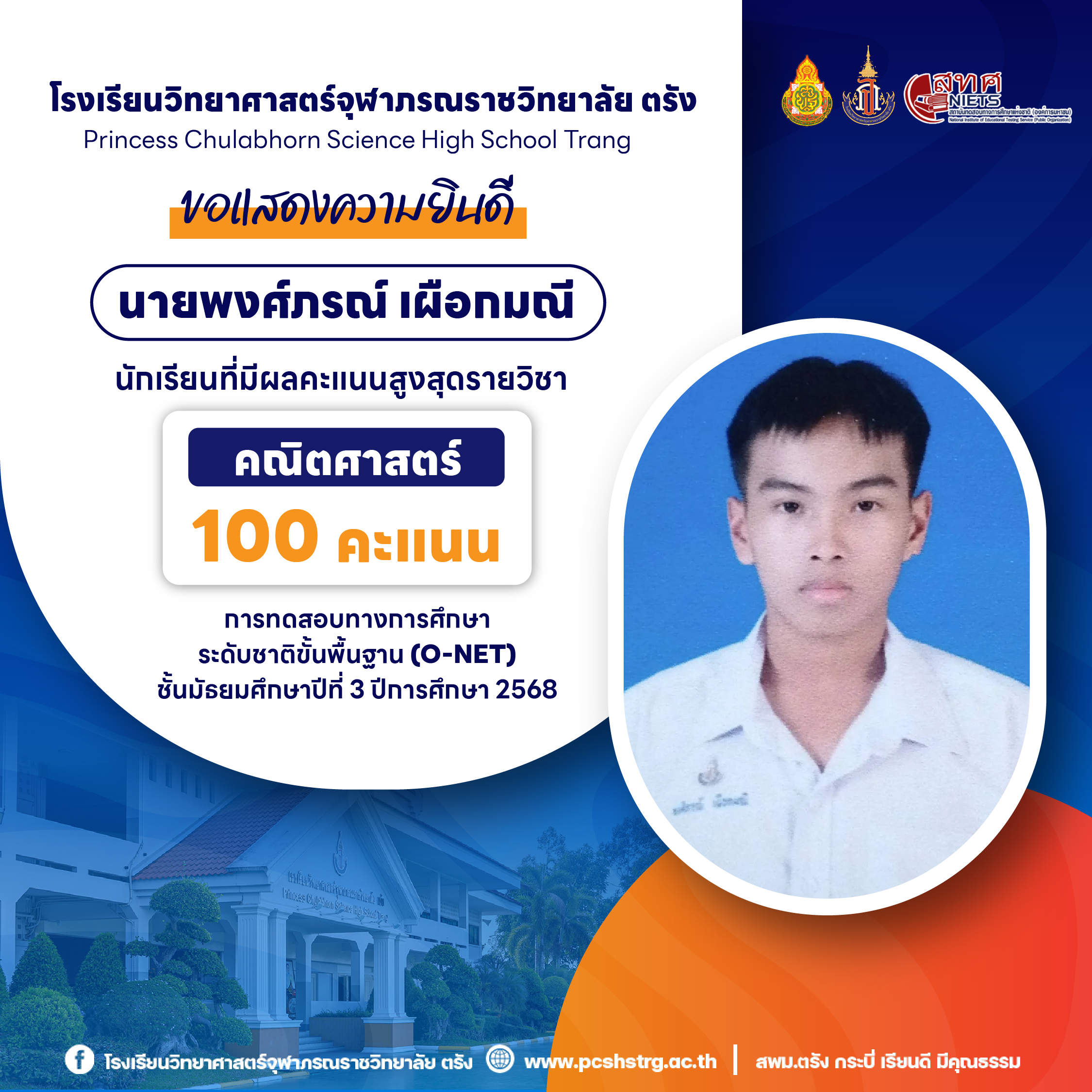 ขอแสดงความยินดีกับนักเรียนที่มีผลการทดสอบทางการศึกษาระดับชาติขั้นพื้นฐาน (O-NET) ชั้นมัธยมศึกษาปีที่ 3 ปีการศึกษา 2568 รายวิชาคณิตศาสตร์ 100 คะแนนเต็ม จำนวน 20 คน และนักเรียนที่มีผลคะแนน วิทยาศาสตร์ อังกฤษ ภาษาไทย สูงสุด