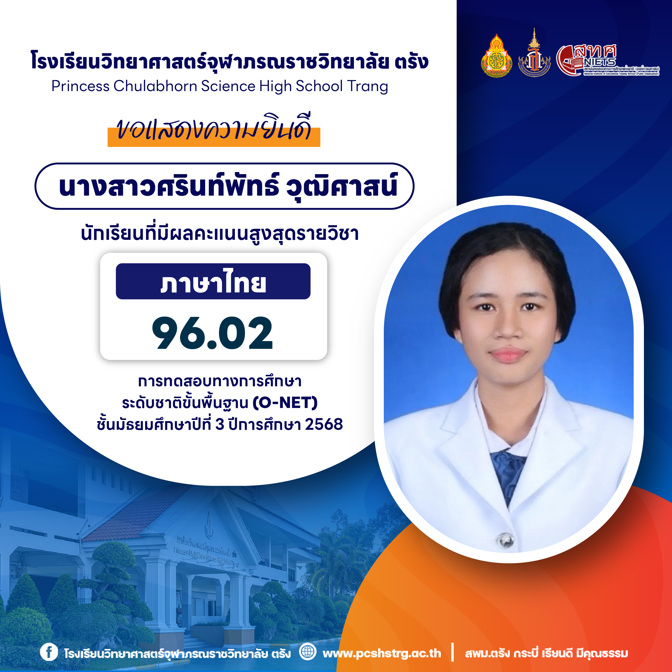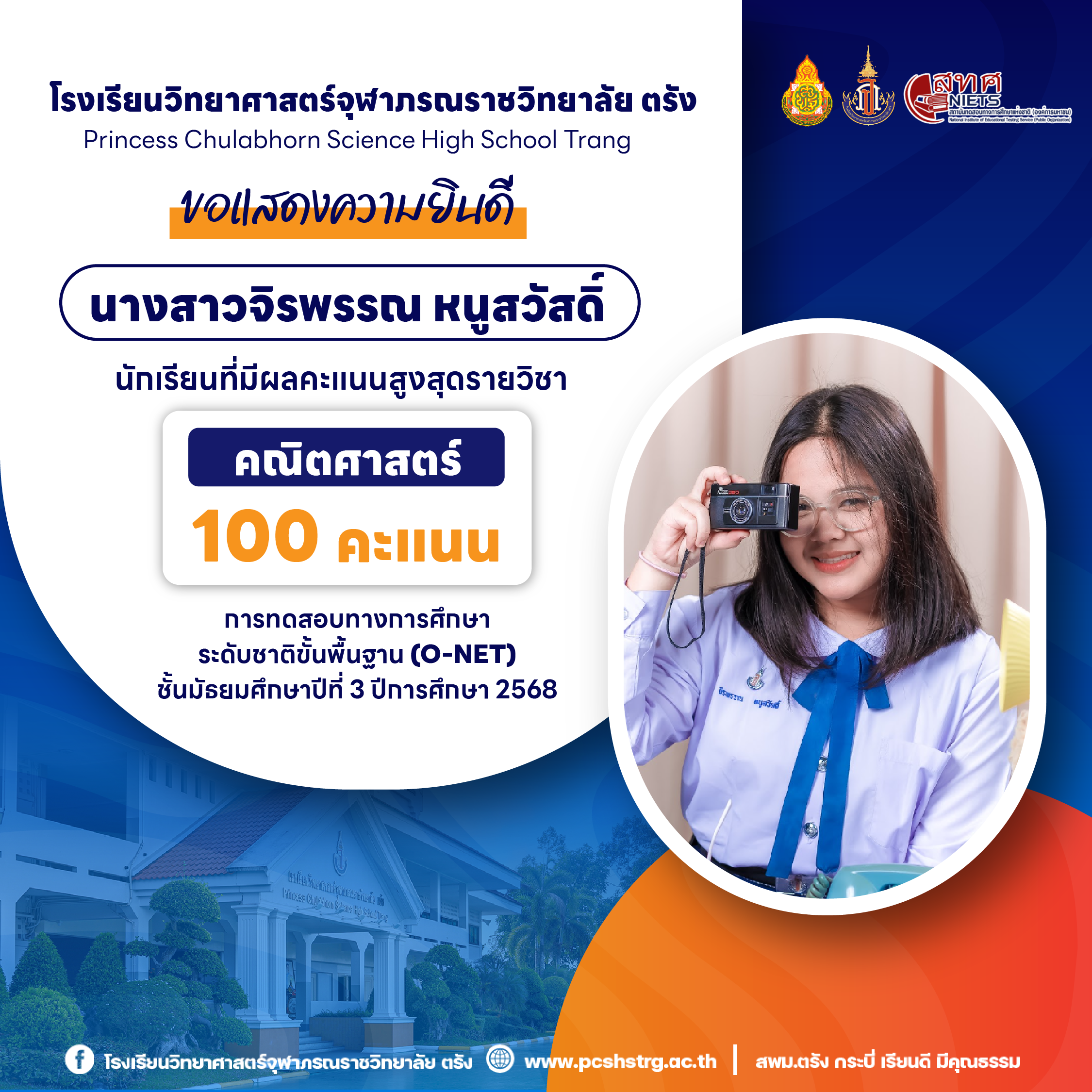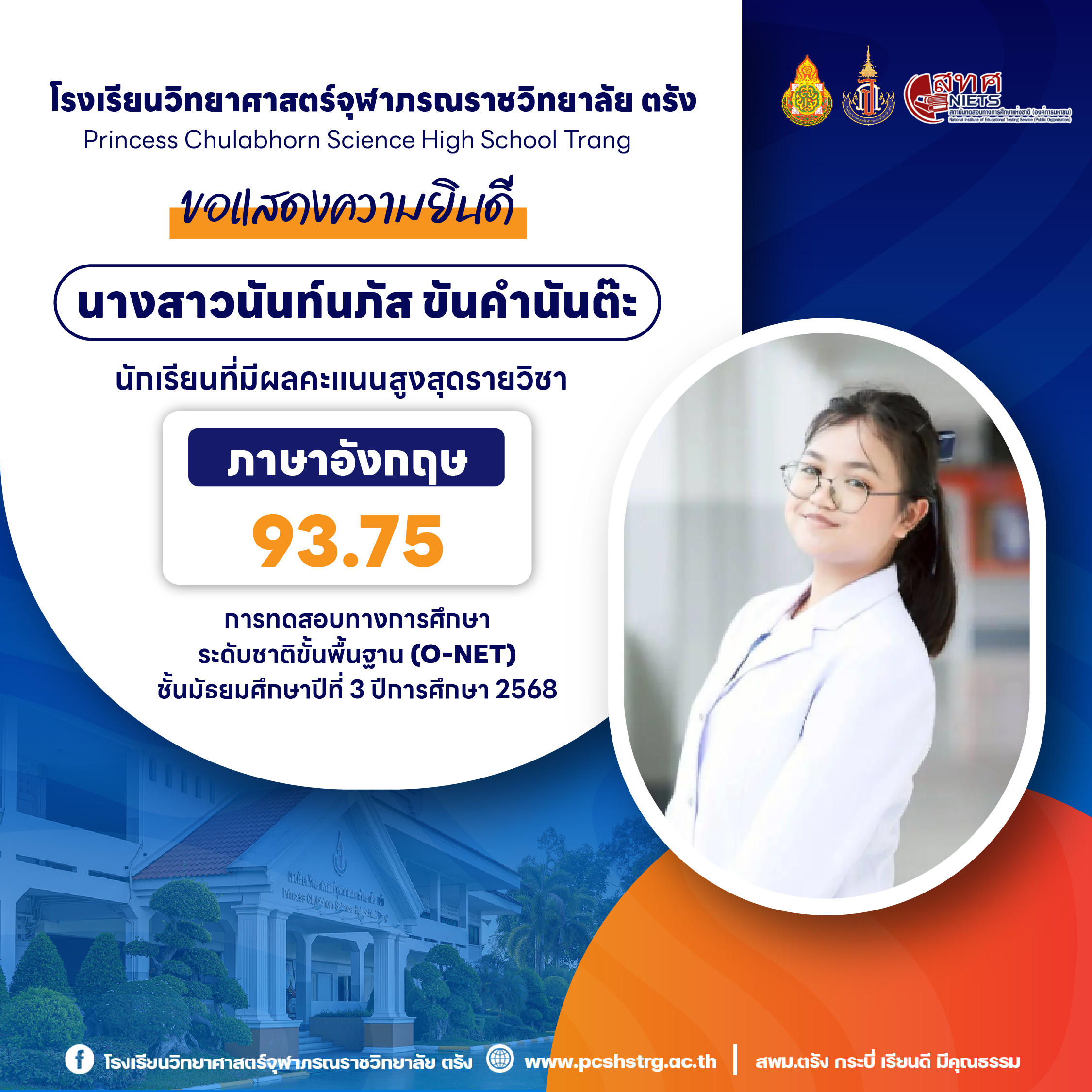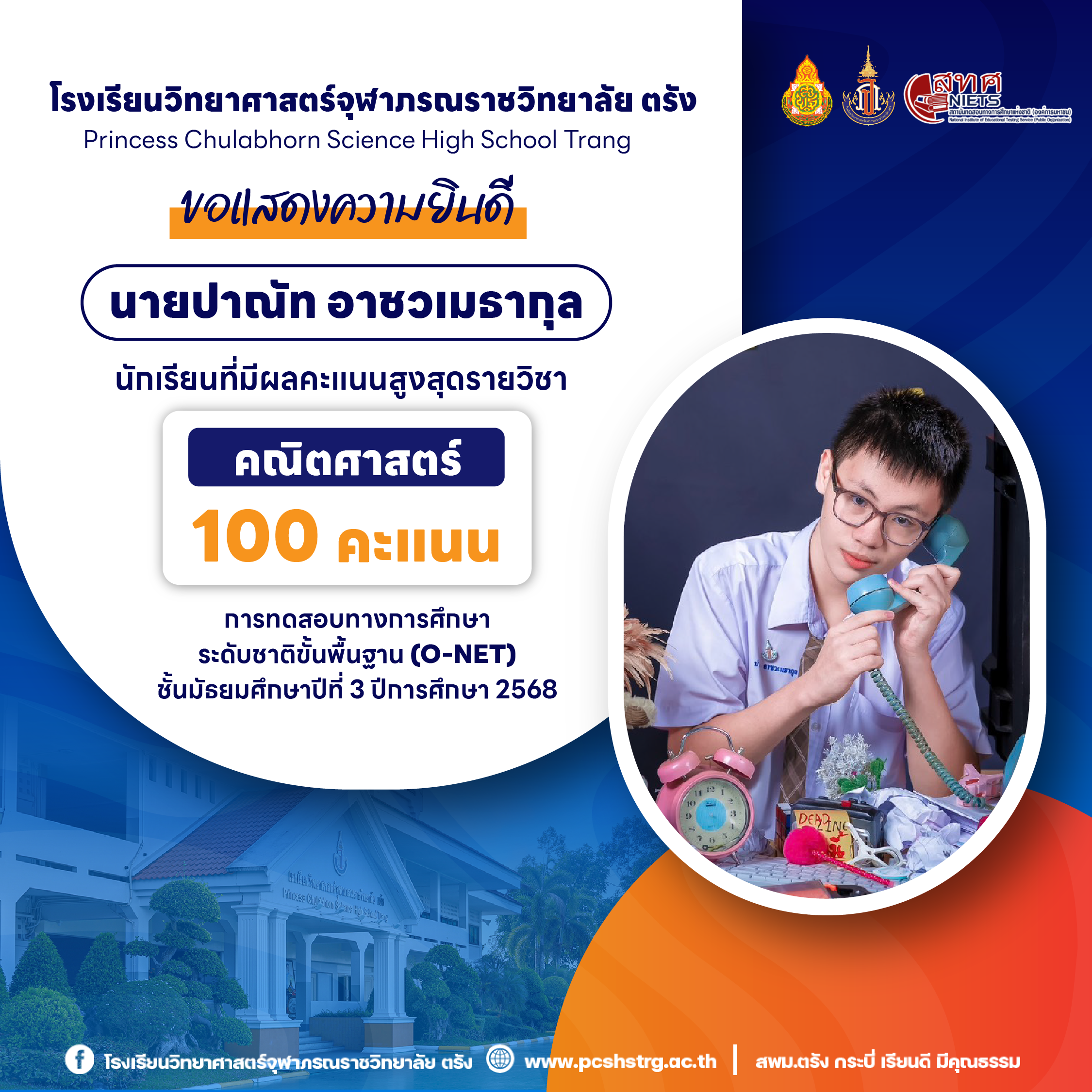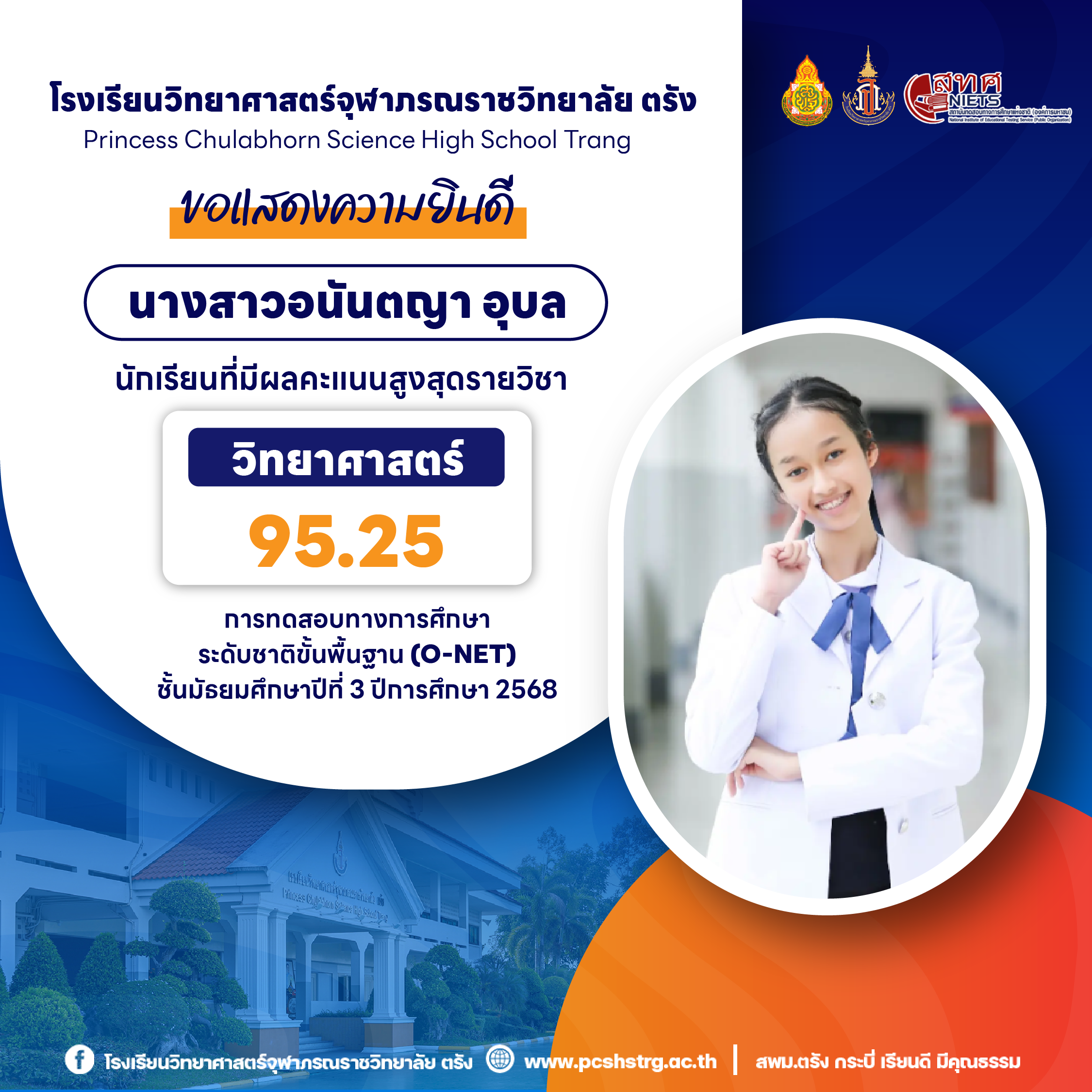 ขอแสดงความยินดีกับนักเรียนที่มีผลการทดสอบทางการศึกษาระดับชาติขั้นพื้นฐาน (O-NET) ชั้นมัธยมศึกษาปีที่ 3 ปีการศึกษา 2568 รายวิชาคณิตศาสตร์ 100 คะแนนเต็ม จำนวน 20 คน และนักเรียนที่มีผลคะแนน วิทยาศาสตร์ อังกฤษ ภาษาไทย สูงสุด